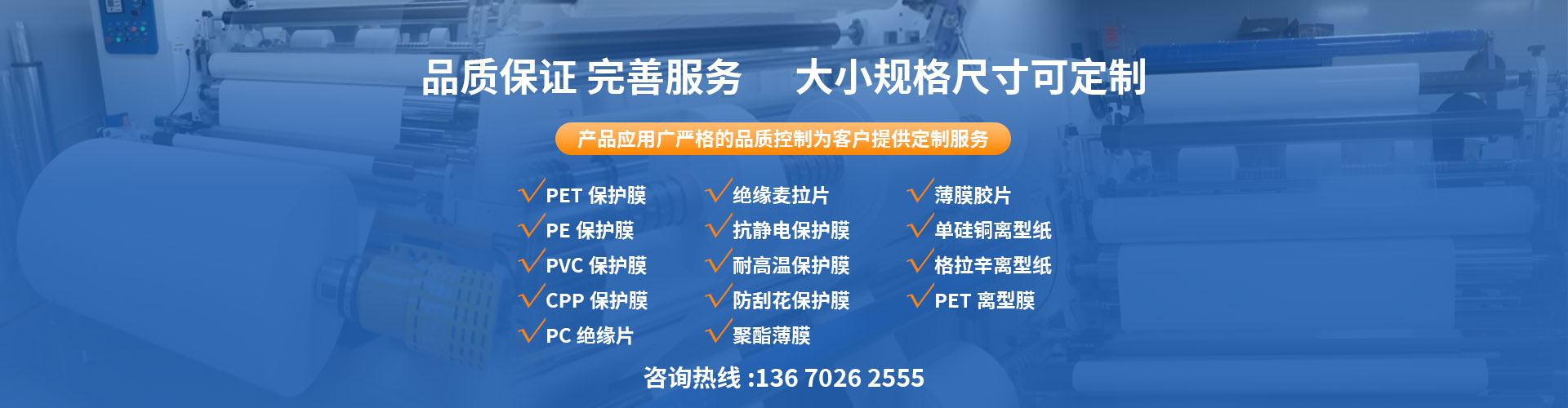 PVC保护膜是由PVC薄膜基材单面涂胶,亚克力胶或烯酸胶贴附性能极佳,抗张力强,耐寒性好,抗老化性能强,单面粘贴,无残胶,遮蔽性能好,耐磨抗溶剂等。